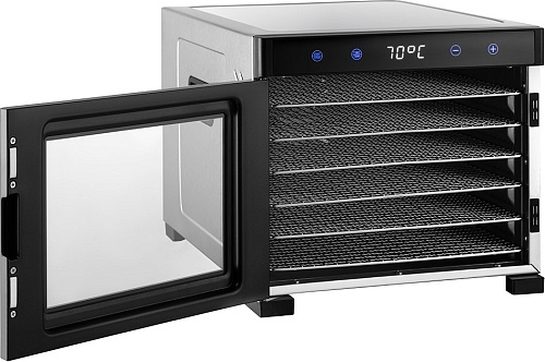 Оснащен 6 сушильными пластинами из нержавеющей стали, двумя лотками RAW, которые идеально подходят для сушки жидких и мягких ингредиентов, 6 лотков для трав.